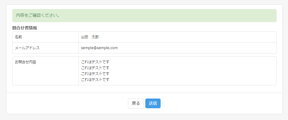これでお問い合わせ情報を入力後に確認画面が表示されるようになりました。