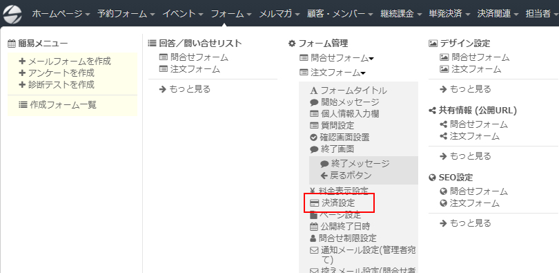 ログインしたらページ上部ヘッダーより「フォーム」→「フォーム管理の該当フォームタイトル」→「決済設定」をクリックします。