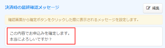 「決済時の最終確認メッセージ」の設定エリアに登録したメッセージ情報が表示されます。