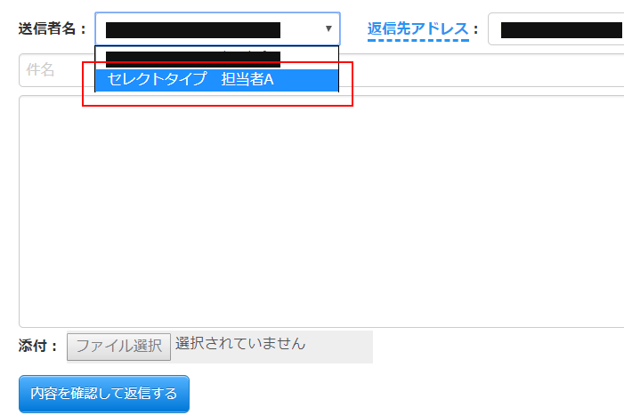 この担当者専用画面から返信する際に、メールの送信者名を指定することができます。