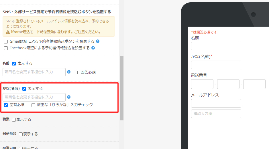 このようにSELECTTYPEのメールフォームの個人情報入力欄「かな(名前)」の登録を厳密にチェックが可能です。