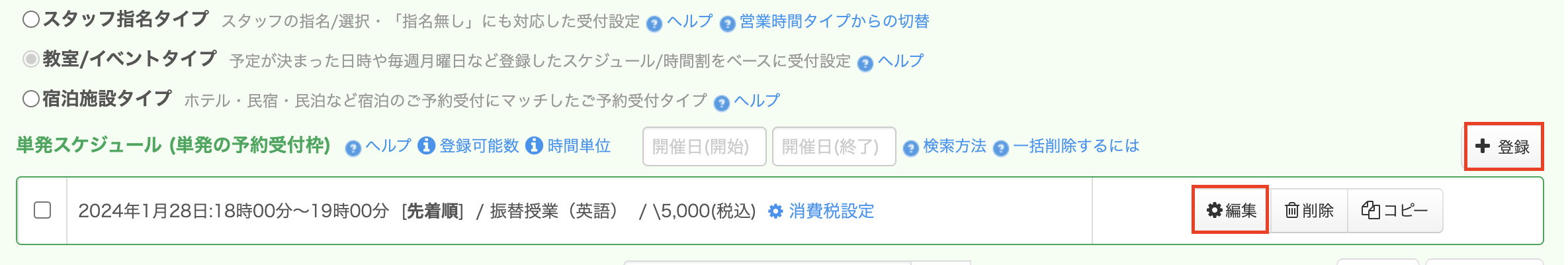 既に作成済みの単発スケジュールに設定をする場合は、対象スケジュールの「編集」を、新たに作成する単発スケジュールに設定をする場合は「登録」をクリックします。