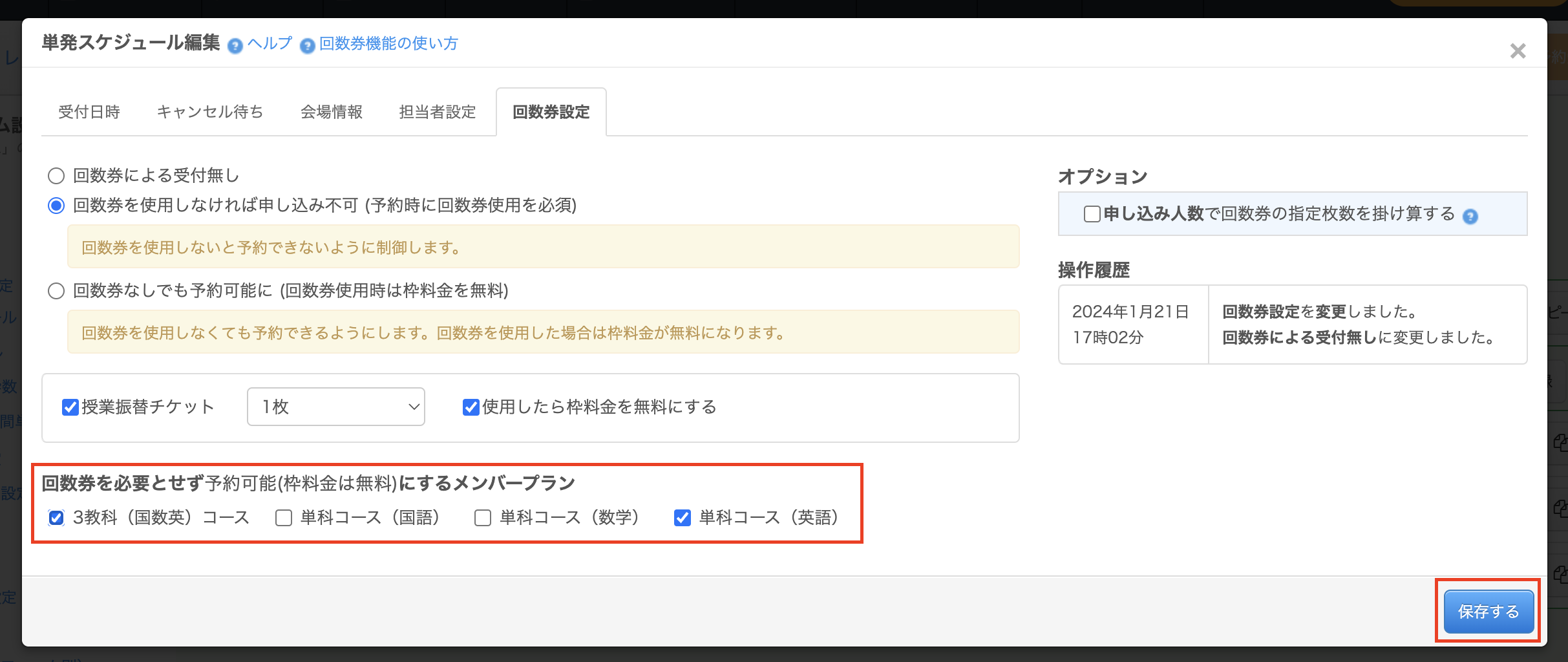 「回数券を必要とせず予約可能(枠料金は無料)にするメンバープラン」の欄で、対象のメンバープランを選択し、「保存する」をクリックします。
