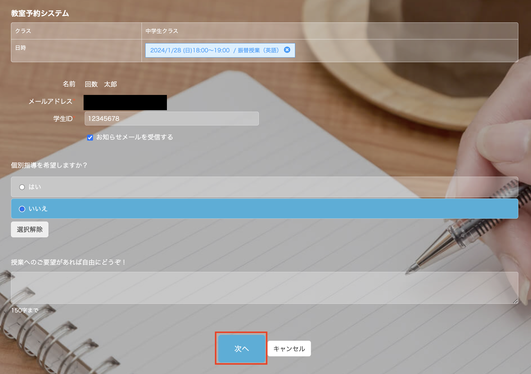 予約者情報の入力画面が表示されますので、内容を入力し、「次へ」をクリックします。