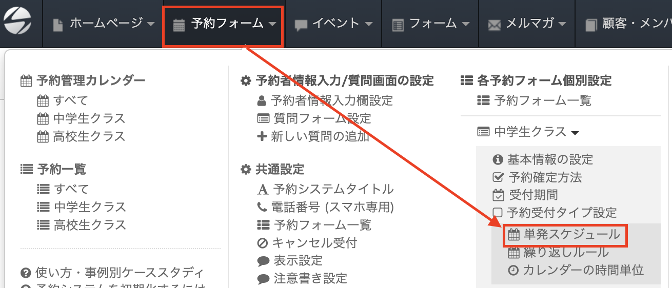 本設定をいただくには、「予約フォーム」→「予約受付タイプ設定」→「単発スケジュール」をクリックします。