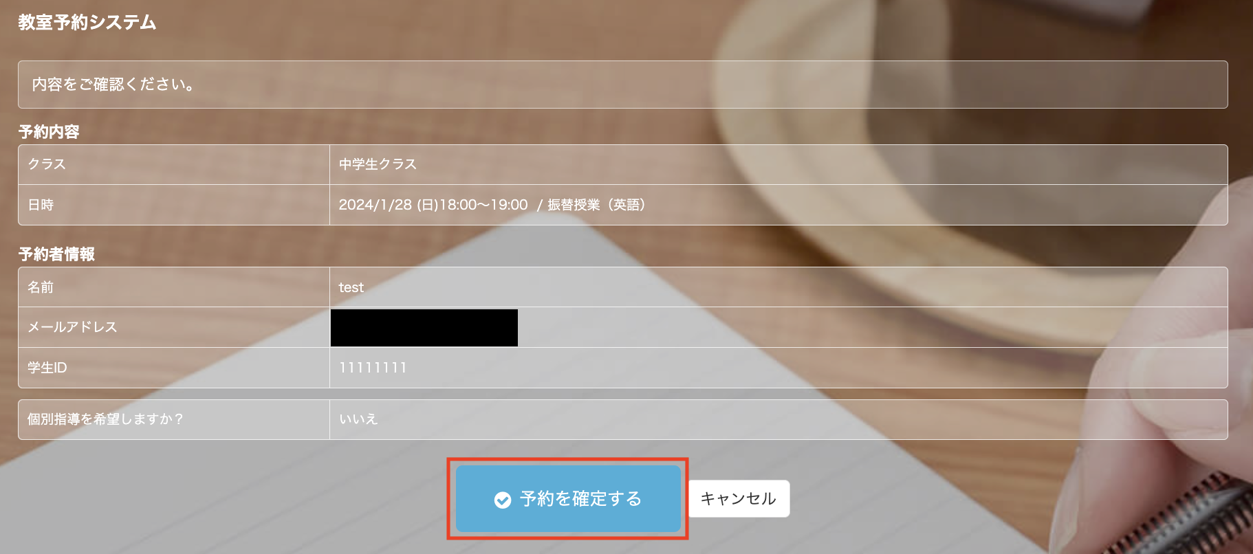 内容確認の画面が表示されます。内容を確認し、「予約を確定する」をクリックします。
