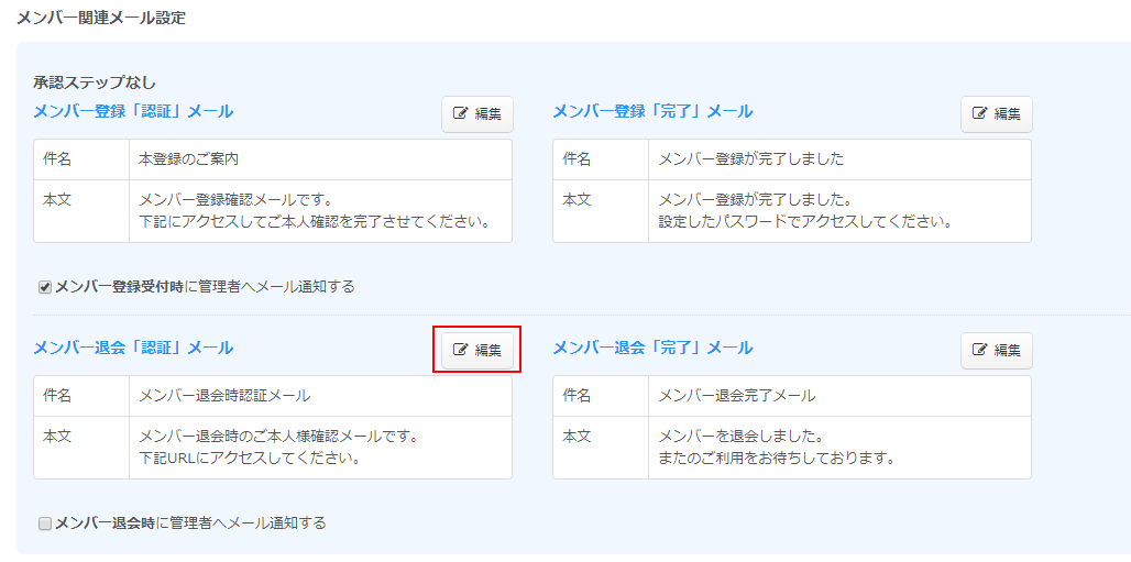 「メンバー退会「認証」メール設定」の「編集」ボタンをクリックします。