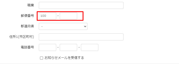このように、入力した郵便番号情報に対応した「都道府県」「住所」情報が自動で補完入力されます。