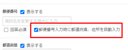 「郵便番号入力時に都道府県、住所を自動入力」にチェックをします。