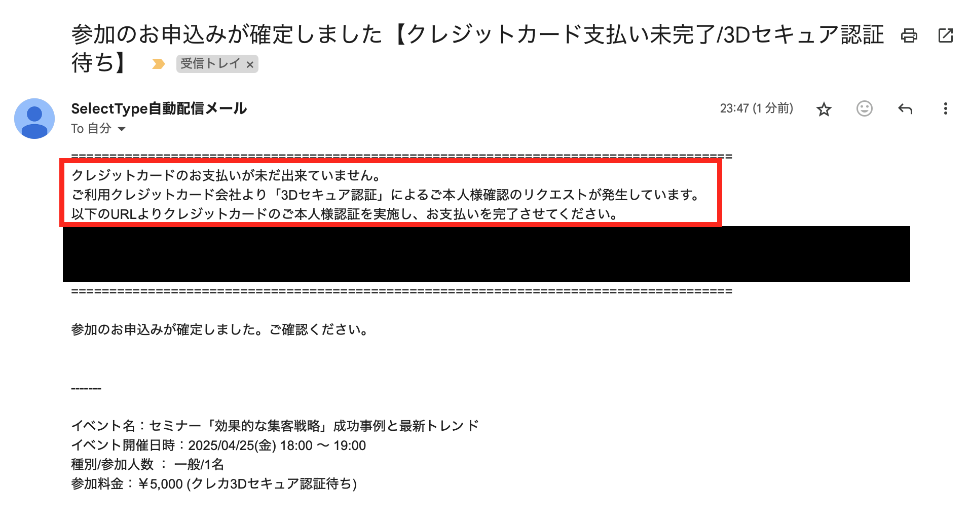 イベント申込が確定すると、お客様には3Dセキュア認証を依頼するメールが送信されます。メールに記載されているリンクをクリックします。