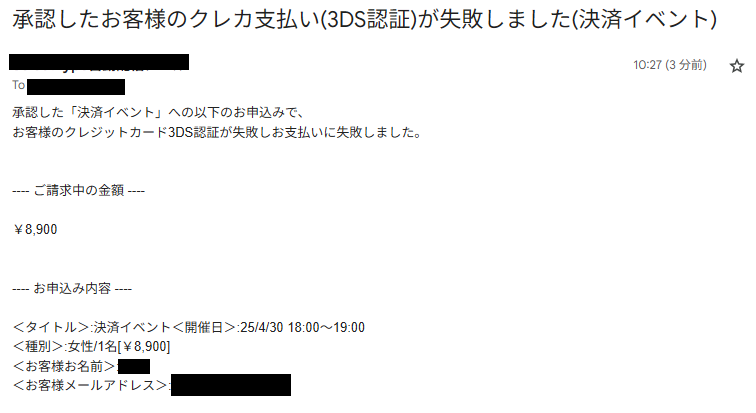 3Dセキュア認証に失敗すると管理者宛てに失敗したことが記載されたメールで通知が届きます。
