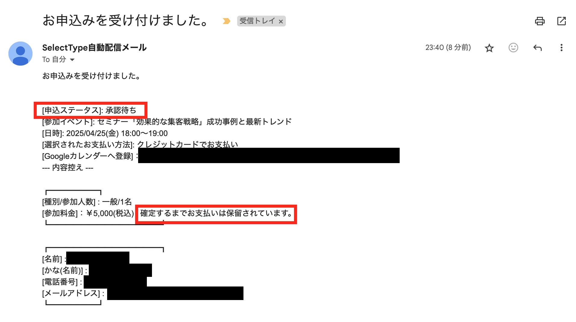 お客様には、イベント申込は承認待ちであり、支払いはイベント申込が確定するまで保留される旨のメールが送信されます。
