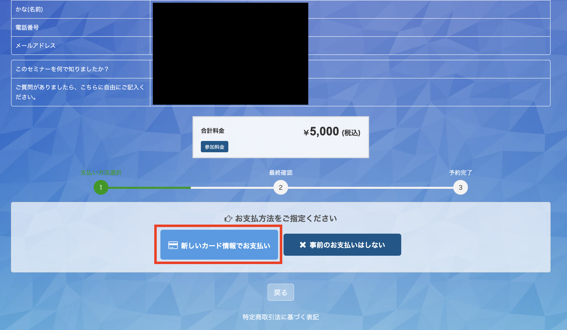 イベントの申込みフォームで「新しいカード情報でお支払い」をクリックします。