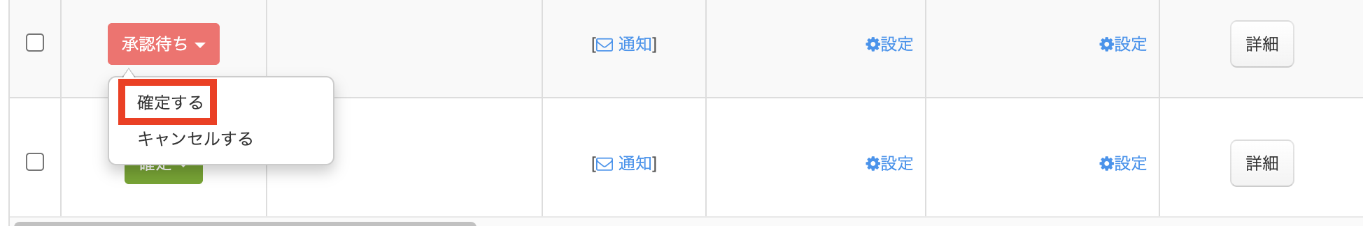 参加申込一覧の「承認待ち」をクリックすると表示される、「確定する」を選択します。