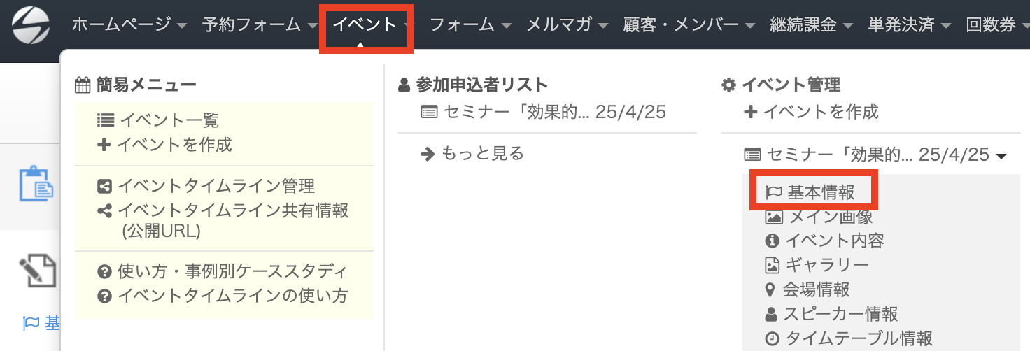 イベント申込を承認するには、管理画面のヘッダーの「イベント」をクリックし、該当のイベントの「基本情報」をクリックします。