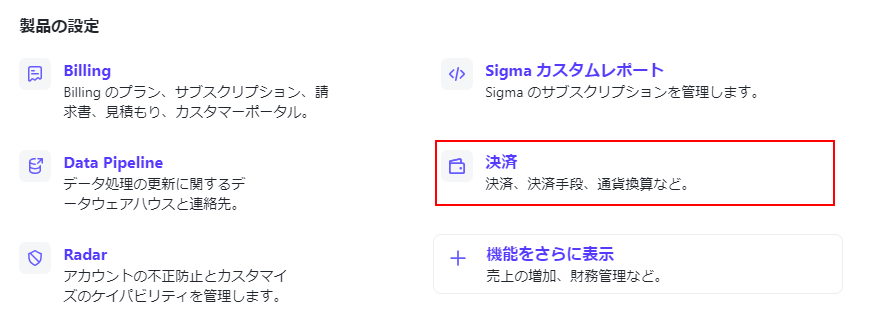 「製品の設定」エリアにある「決済」リンクをクリックしてください。