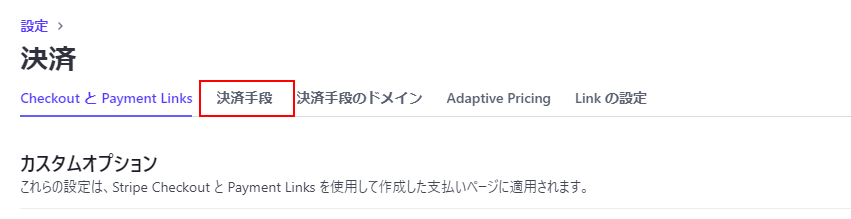 決済設定が表示されますので「決済手段」をクリックして画面を切り替えます。