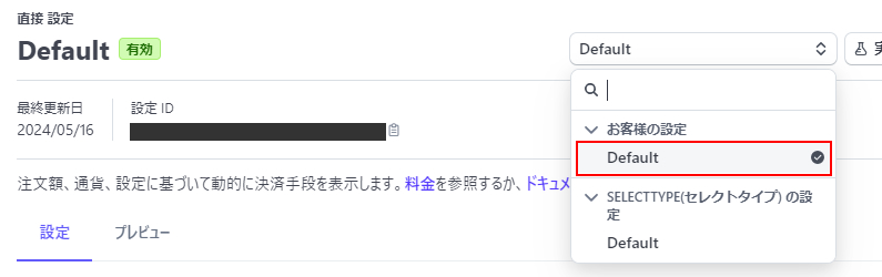 これが「SelectType(セレクトタイプ)の設定」が有効になっている場合、「お客様の設定」の「Default」をクリックします。