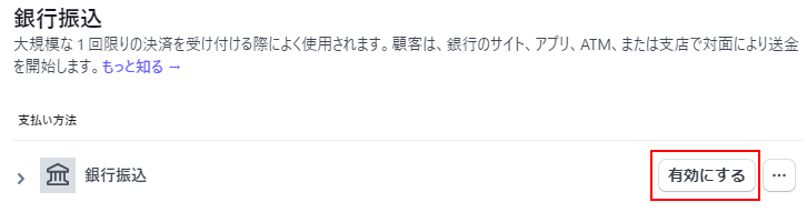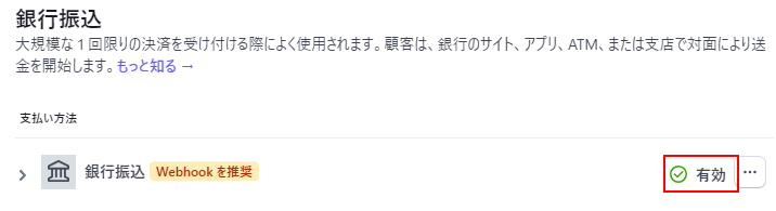銀行振込が利用可能な状態になるとステータスが「有効」となります。