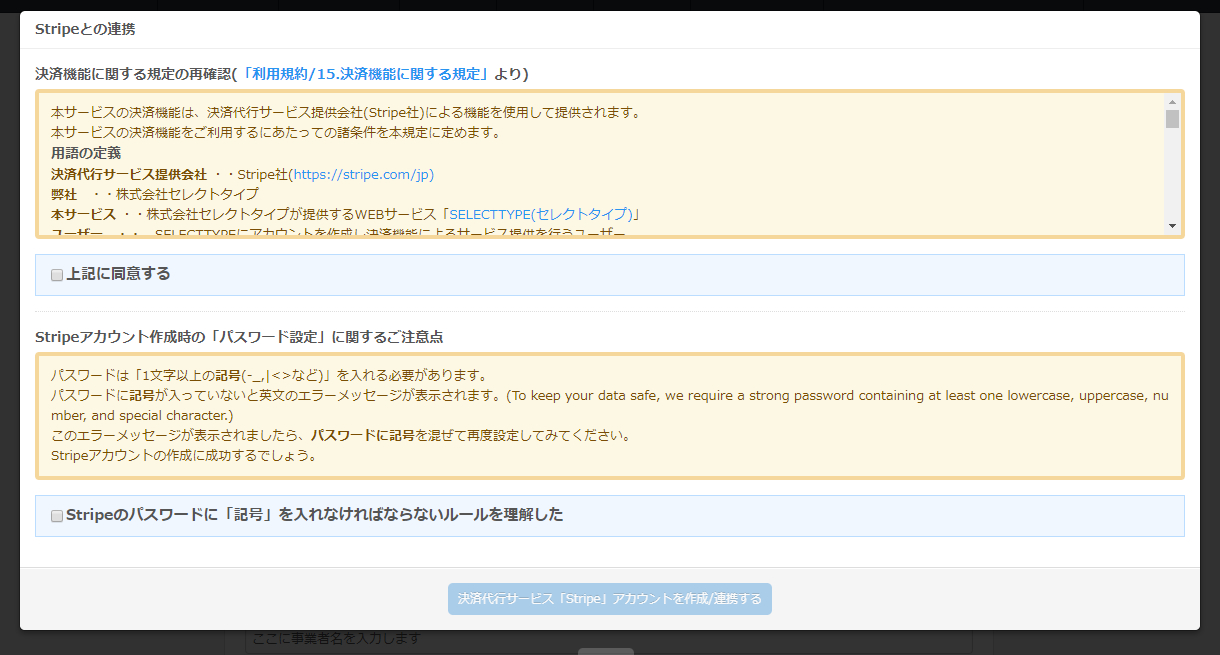 「決済機能に関する規定」と「Stripeのアカウント作成時の注意点」が記載されていますので、内容をしっかりと確認したうえで、