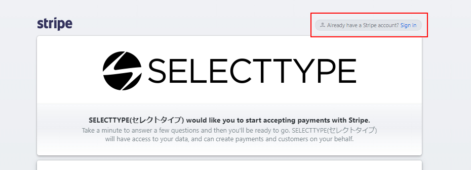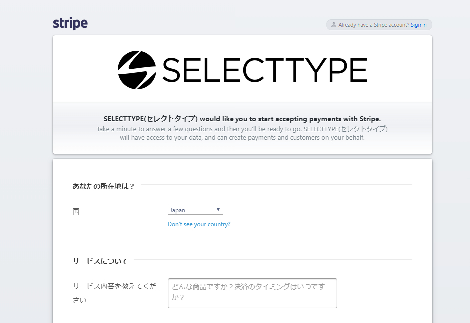 SELECTTYPEでオンライン決済機能を使用するには、Stripeのアカウントを作成して、そのアカウントと連携させます。