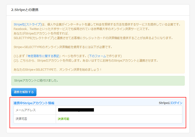 アカウント登録と連携が問題なく完了しますと、SELECTTYPEの決済機能設定画面に戻ります。