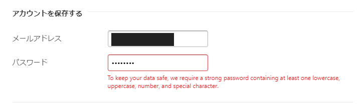 Stripeのアカウントに必要なパスワードには「1文字以上の記号(-_,|<>など)」を入れる必要があります。