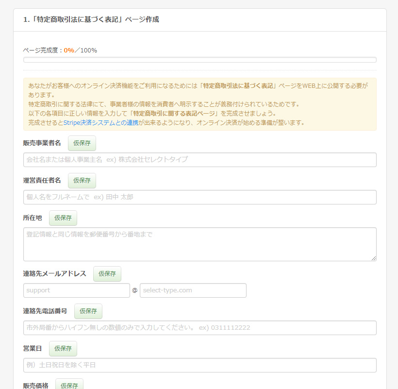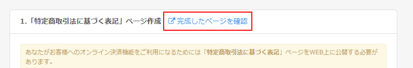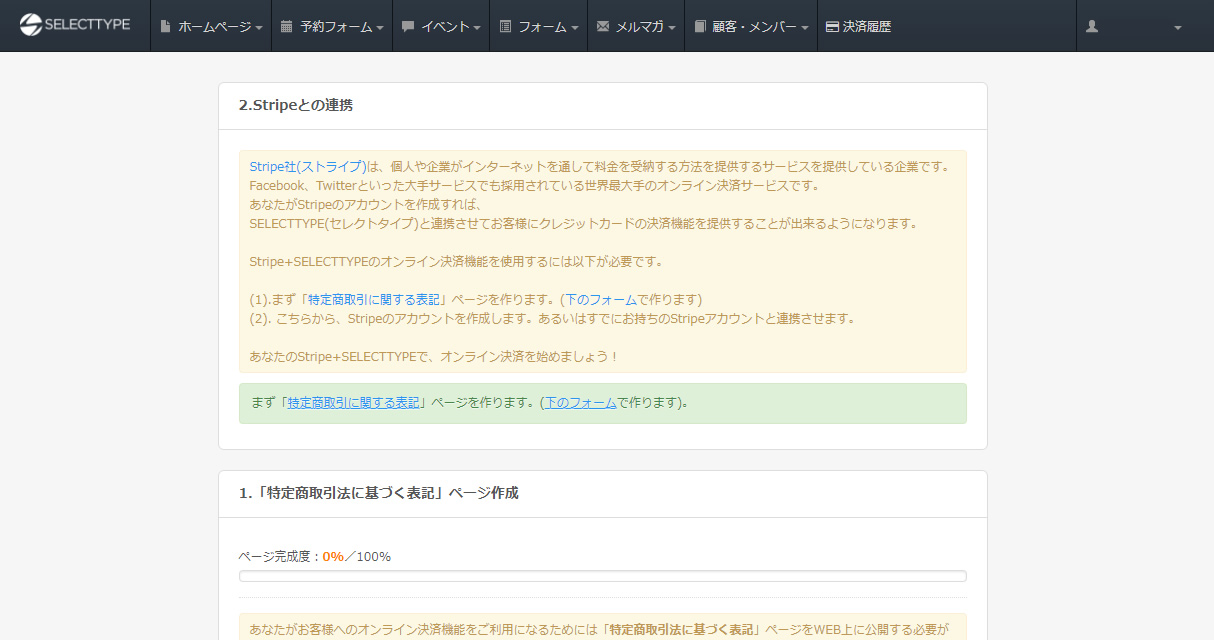 特定商取引法に基づく表記ページをの作成が完了しますと、2のStripeとの連携に進むことができます。