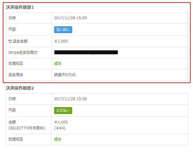 このようにSELECTTYPEの管理画面では、決済された料金の返金操作が可能です。