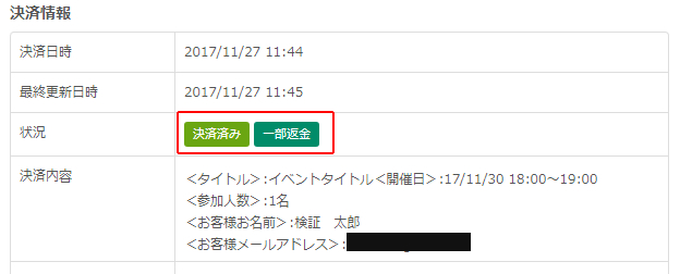 全額返金された場合、決済情報のステータスは「払い戻し済み」に切り替わります。