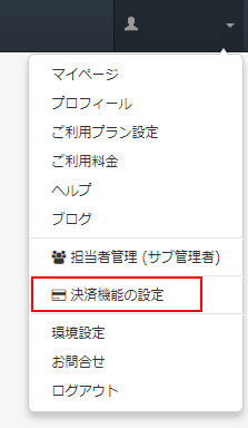 ログインしたらページ上部ヘッダーの一番右側のアカウント名の記載されたメニューより「決済機能の設定」をクリックします。
