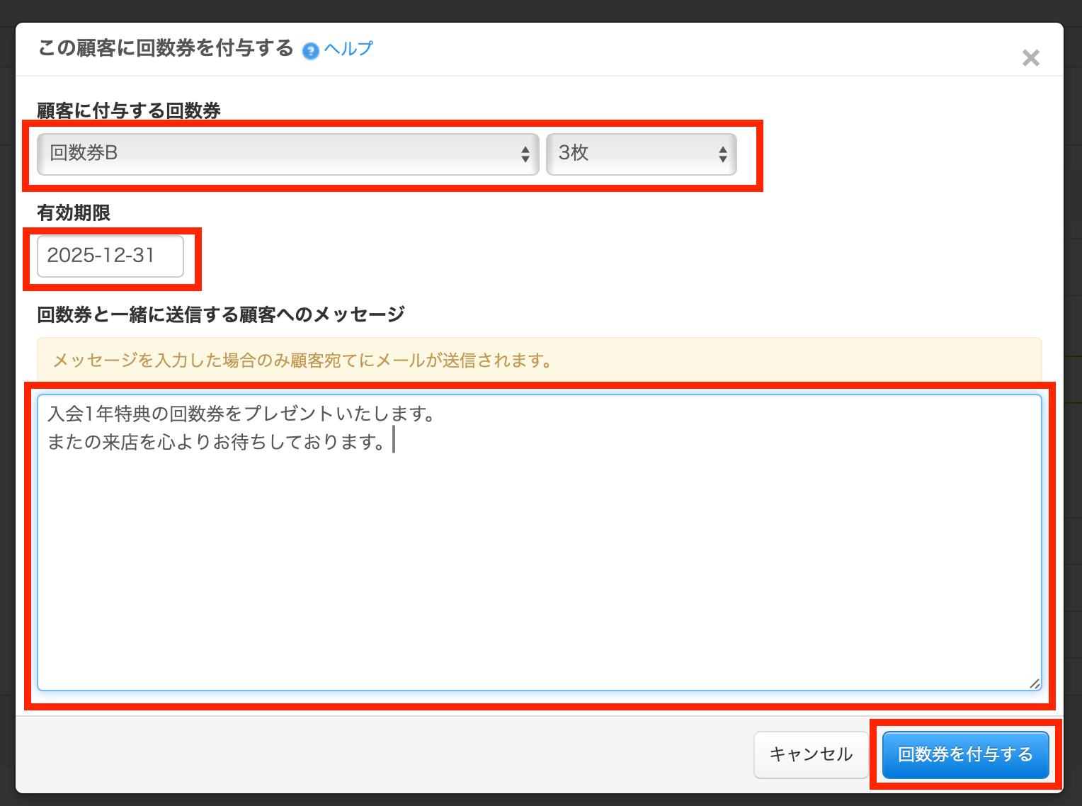 メッセージを入力して付与すると、顧客に自動的にメールが送信されます。メールには回数券の内容やメッセージが記載されます。