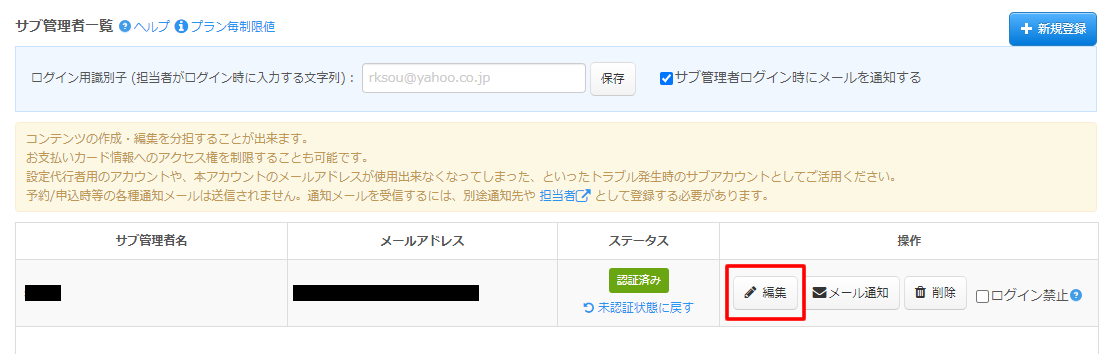 IPアドレスで制御したいサブ管理者の「編集」ボタンをクリックします。