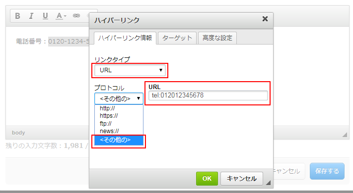 リンクタイプを「URL」、プロトコルを「その他」、URLを「tel:電話番号」を入力します