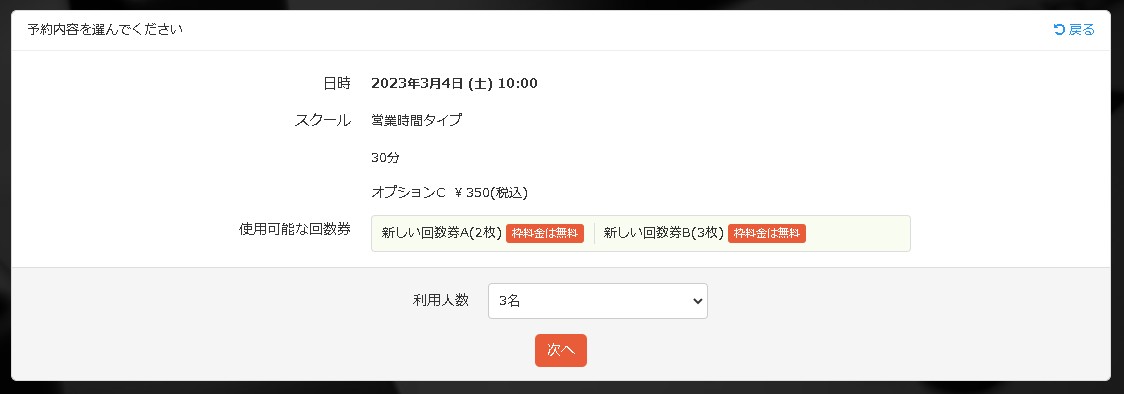 このようにSelectTypeの予約システムでは、枠ごと/メニューごとに回数券の必要枚数を申込人数によって掛け算する/しないを細かくご調整いただくことが可能です。