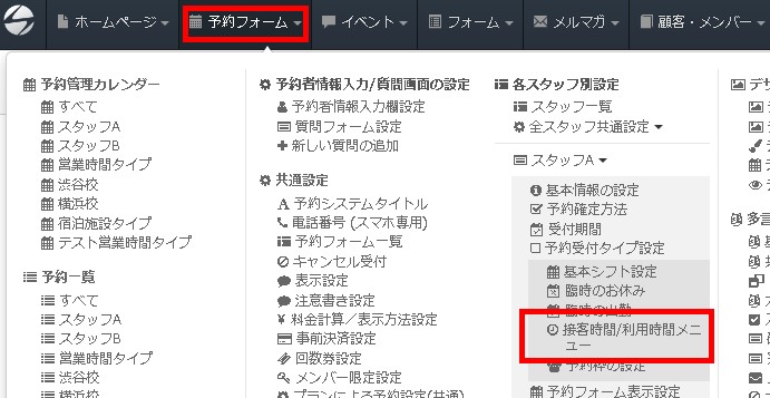 「予約フォーム」→目的の予約フォームの「接客時間/利用時間メニュー」とクリックします。