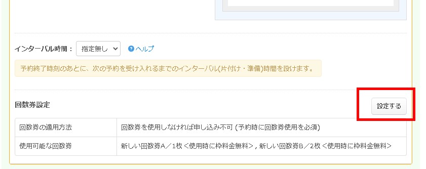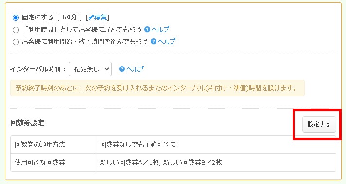 “「利用時間」としてお客様に選んでもらう“指定時は、利用時間メニューごとに「回数券」設定リンクが用意されています。