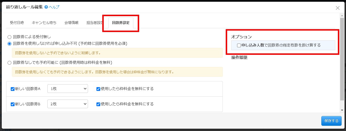 「回数券設定」タブからオプション指定エリアにて申し込み人数で回数券指定枚数の乗算指定が可能です。
