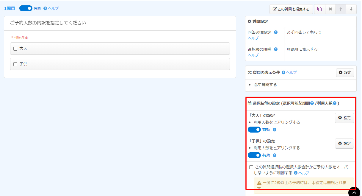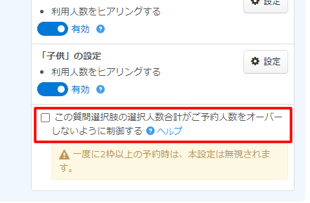 ヒアリング設定が終わったら、「この質問選択肢の選択人数合計がご予約人数をオーバーしないように制御する」をチェックします。