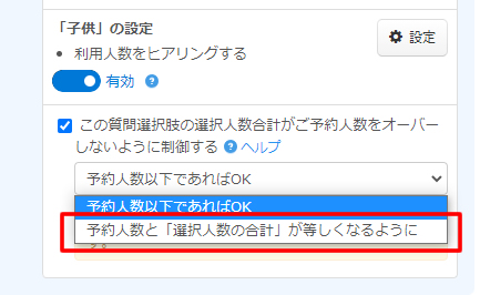 デフォルトは「予約人数以下にする」になっているので「予約人数と「選択人数の合計」が等しくなるように」に切り替えます。