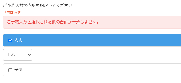 質問選択肢で選んだ利用人数が予約人数より少ない場合や多い場合には予約を進めようとするとエラーが表示されるようになります。