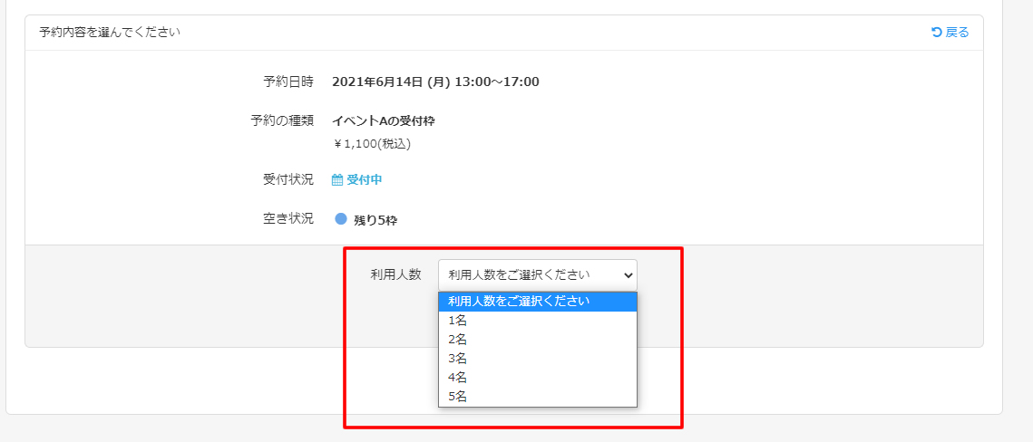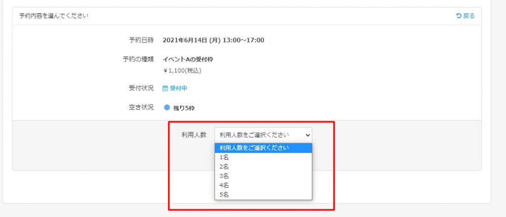 予約人数と同じ人数が選択された場合のみ予約を進めることができるようになります。