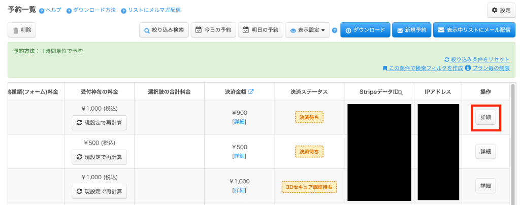 取り消したいクーポンコードを使用した予約の「詳細」をクリックします。