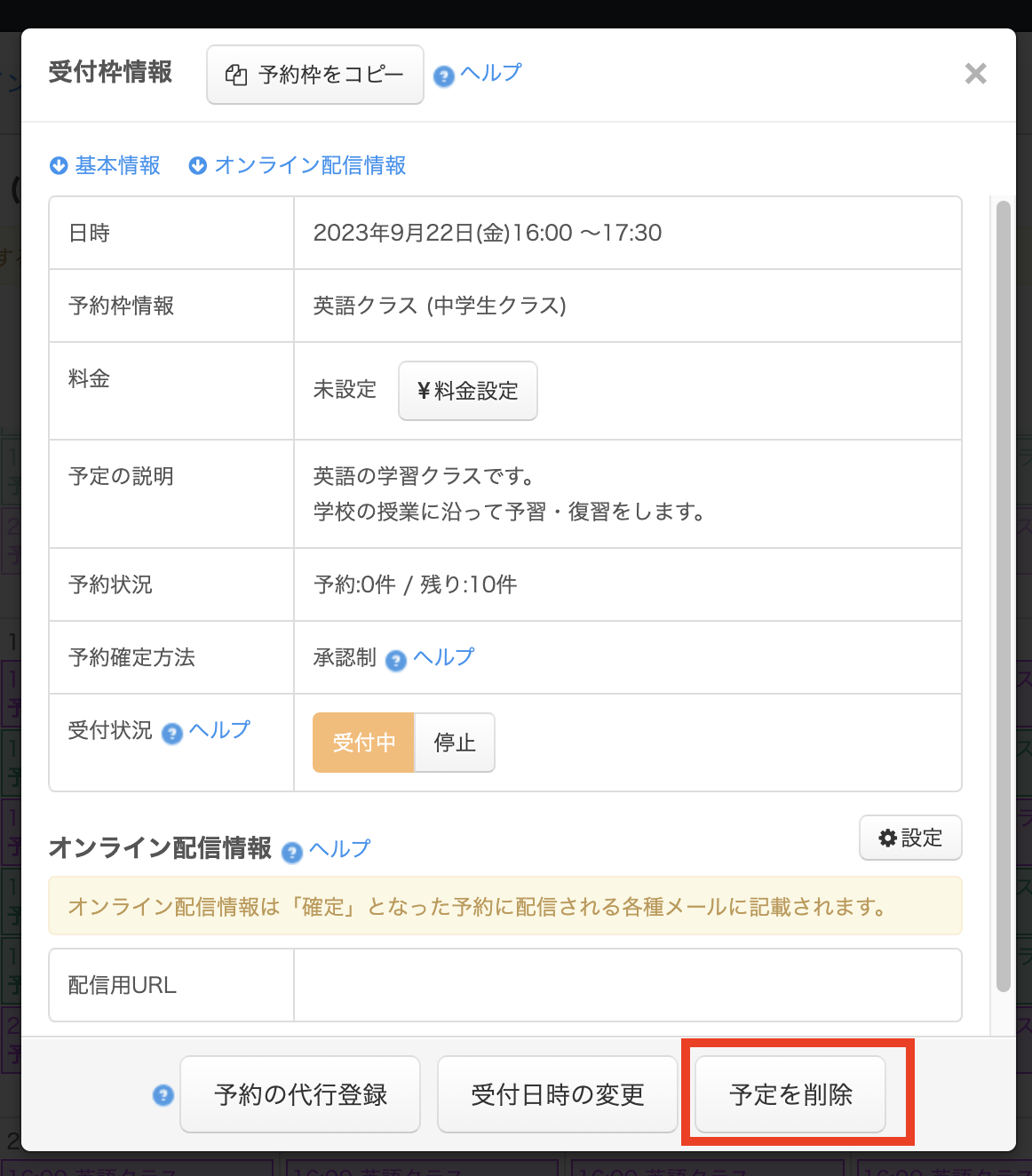 繰り返しの設定がされている予約枠(繰り返しルール)であれば、「この予定のみ」「この予定以降すべて」「定期的な予定すべて」の3つのボタンが表示されます。