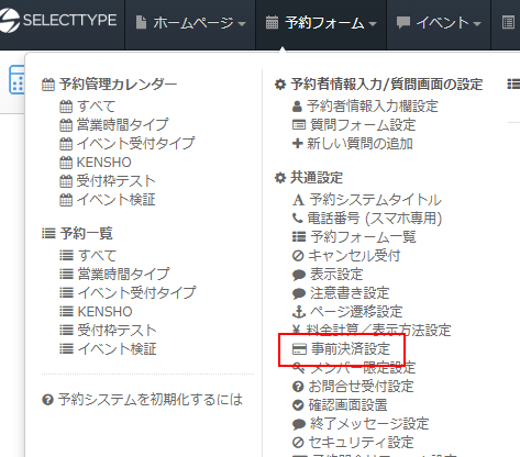 ログインしたらページ上部ヘッダーより「予約フォーム」→「共通設定/事前決済設定」をクリックします。