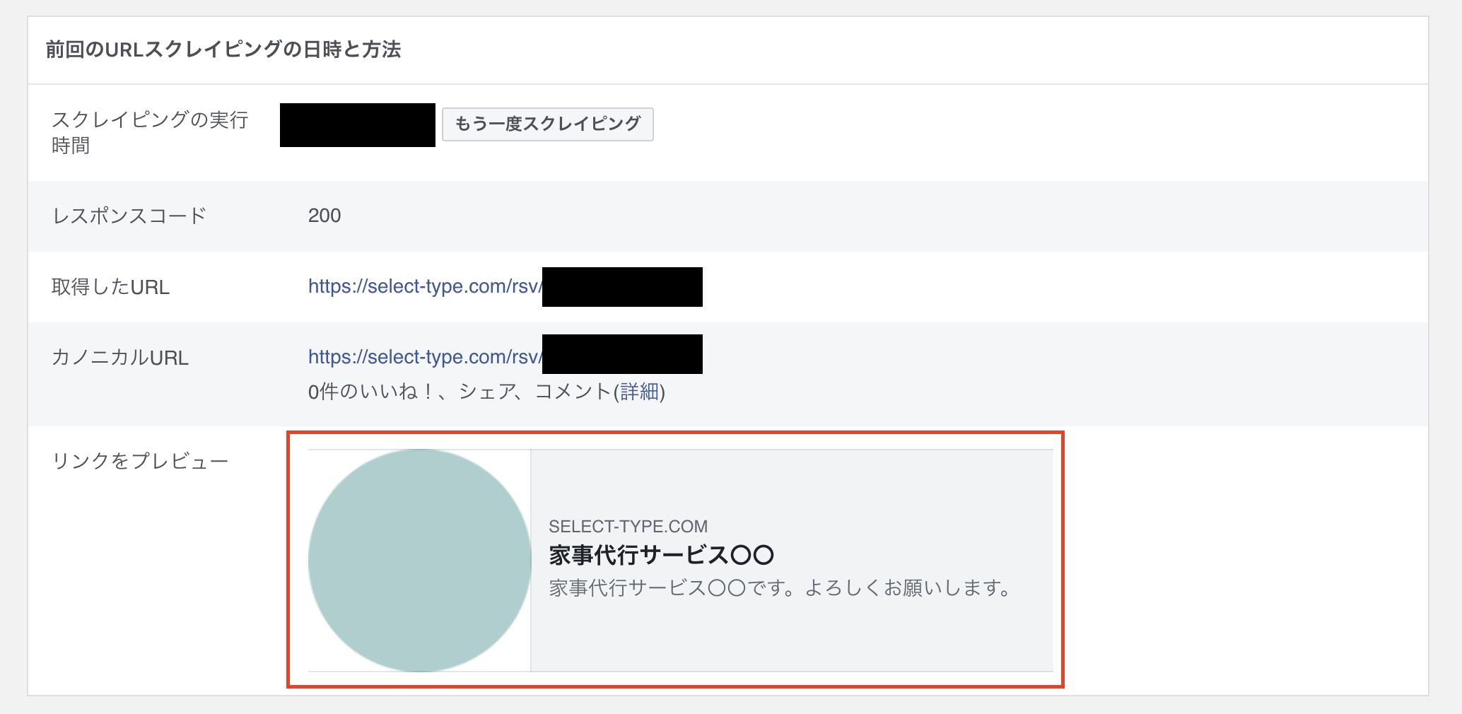 「前回のURLスプレイピングの日時と方法」欄の「リンクをプレビュー」に最新のタイトル、説明文、画像が表示されていることを確認します。