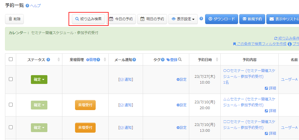 指定した内容で予約リストが絞り込まれます。