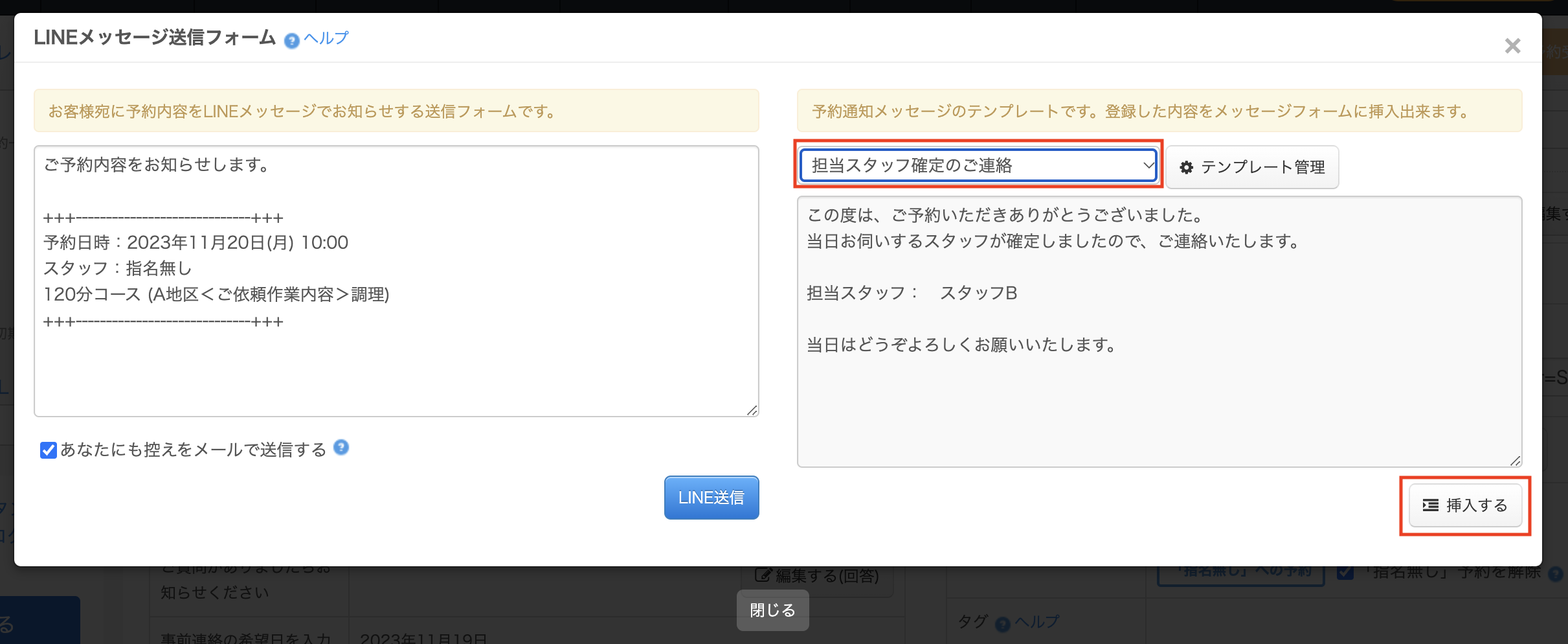 メッセージ内容については、メール送信で利用しているテンプレートを活用することも可能です。画面右側のテンプレート選択より、利用したいテンプレートを選択すると、下にテンプレート内容が表示されます。表示されているテンプレートを利用する場合は、右下の「挿入する」ボタンをクリックします。