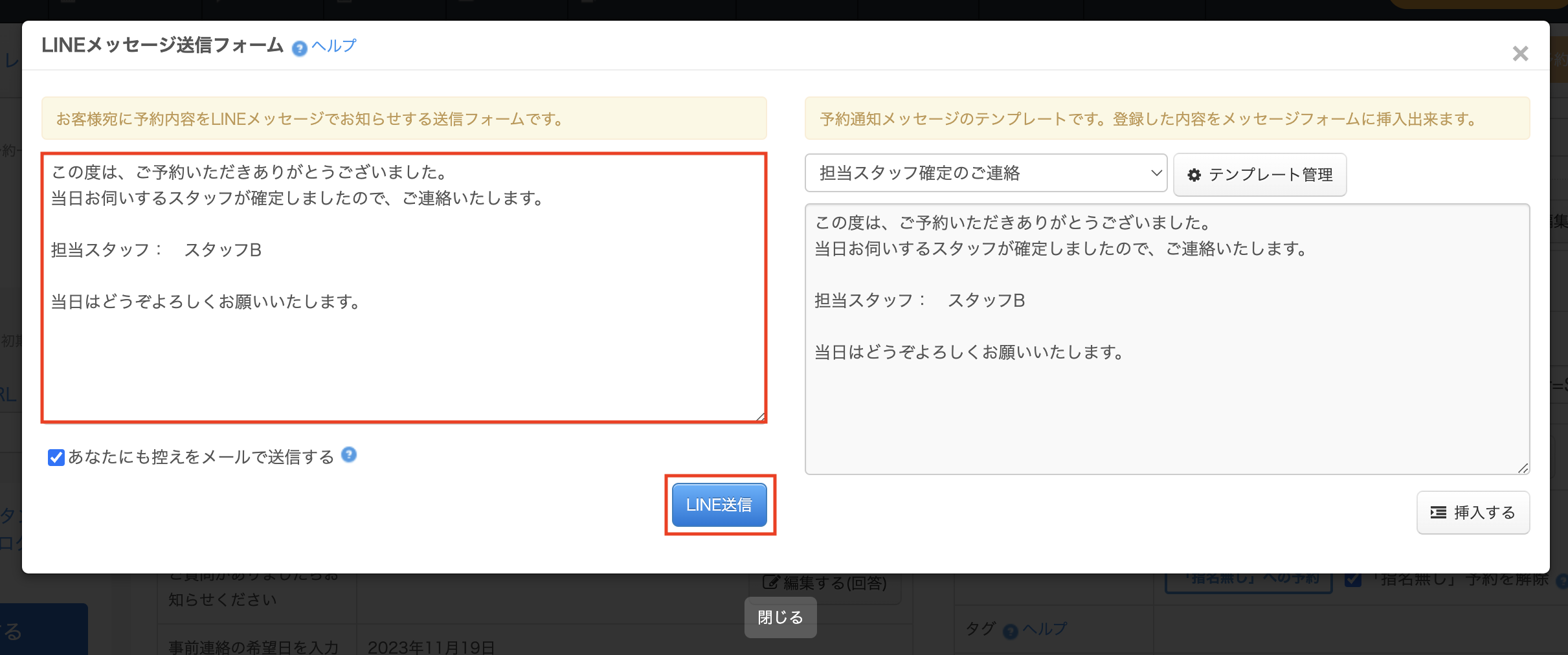 「あなたにも控えをメールで送信する」にチェックを入れて「LINE送信」をクリックすると、お客様のLINEに送信した内容と同内容が貴社の管理者メールアドレスにも送信されます。