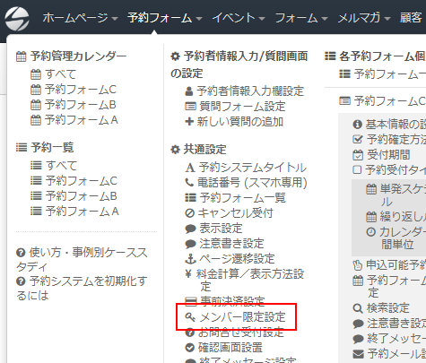 ログインしたらページ上部ヘッダーより「予約フォーム」→「共通設定/メンバー限定設定」をクリックします。